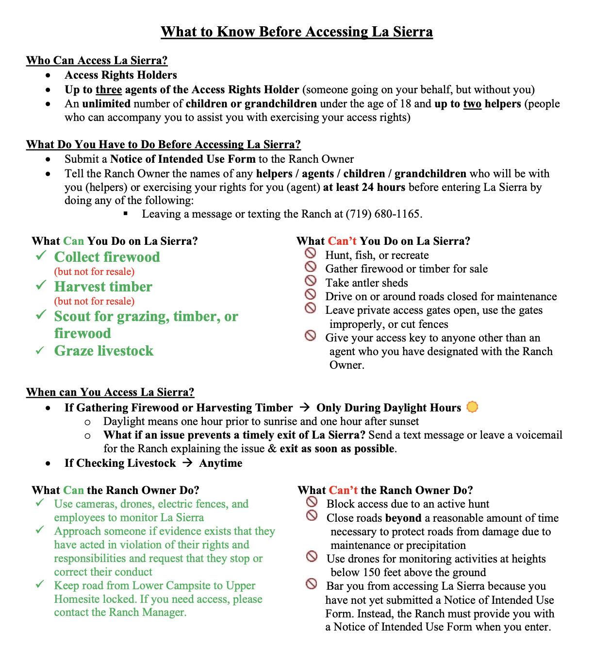 Sept 1 – The court recently approved new rules for local property owners who access La Sierra. The rules that govern rights for firewood, timber, and grazing of livestock on the mountain are agreed on through a process overseen by a court-appointed Special Master. This process is creating a mutual covenant for the land and with one another. Following these rules is an act of respect: for the ecology, and for past and future generations keeping this connection alive. Rules have been agreed on by both the ranch and access rights holders through a mediation process. Those affected are encouraged to get involved locally in order to have their voice heard. Please see the court-approved communication below.